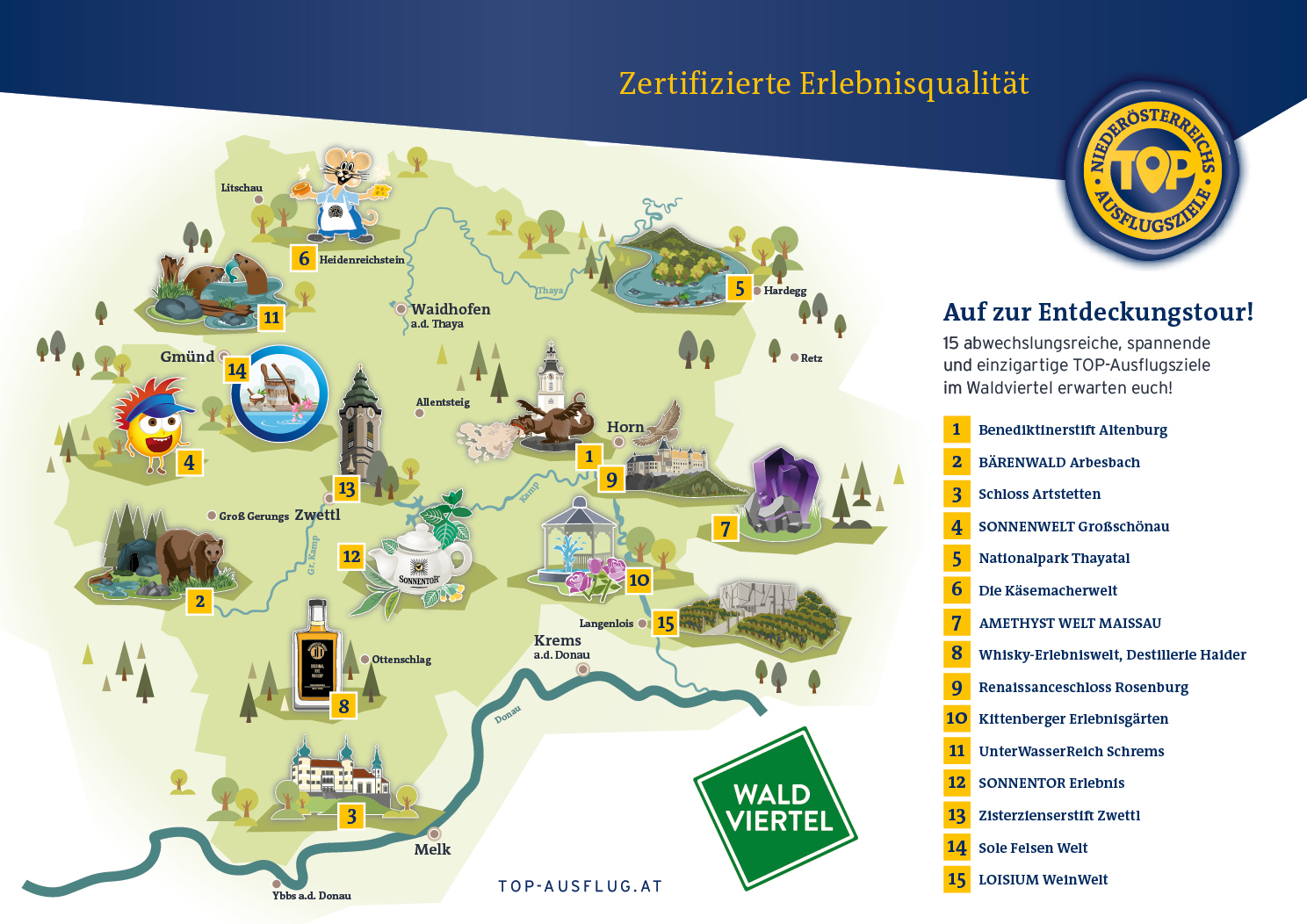Der Ausflugsplaner Waldviertel bietet einen Überblick über die Ausflugsziele der Region – von Burgen und Schlössern bis hin zu Gärten, Naturparks sowie Erlebnisausstellungen ist hier alles zu finden. Stöbere und plane deine individuelle Ausflugstour gleich online!